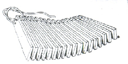 Столько же изготовляется промежуточных деревянных прокладок между ними толщиной 5 мм. Эти прокладки необходимы для разъединения пластин. Без них пластины висели бы соединенными слишком плотно и удары друг о друга получались бы слабыми. В верхней части каждой пластинки на небольшом расстоянии от краев (около 10 мм) и одновременно в приложенной прокладке просверливаются 2 отверстия диаметром около 7 мм. Через все эти отверстия продевается плотный прочный шнур или изолированный провод, и все пластинки, чередуясь с прокладками, повисают на нем. Чтобы пластины всегда были плотно сдвинуты, при выходе из них на шнуре завязывается по 4 узла. Свободные концы связываются в кольцо. Оно должно быть не широким, способным пропустить в образовавшиеся полукольца кисти рук играющего.