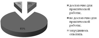 100 % респондентов получили знания по психологии при обучении в высшем учебном заведении, вместе с тем респонденты отметили, что знаний полученных при обучении в вузе для практической работы не достаточно (85%) (рис. 1) и хотели бы иметь больший объем знаний и умений в области психологии (100%).