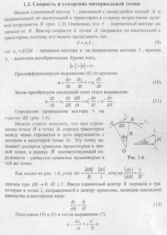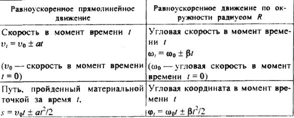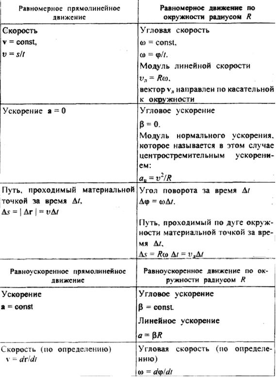 При равномерном движении скорость материальной точки является величиной постоянной, при этом перемещение зависит только от времени. При равнопеременном движении постоянным параметром является ускорение. В данном случае перемещение материальной точки зависит от времени и скорости движения. В случае движения материальной точки по окружности, мы сталкиваемся с понятием тангенсального нормального ускорения. Основные формулы кинематики материальной точки представлены в таблице 1.