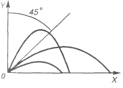 Наибольшая дальность полета (при постоянном значении υ0) достигается при α= π/4 (рис. 2). При наличии сопротивления дальность полета и высота подъема уменьшаются в 1,5—2 раза.